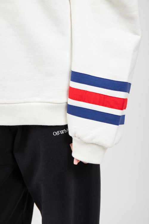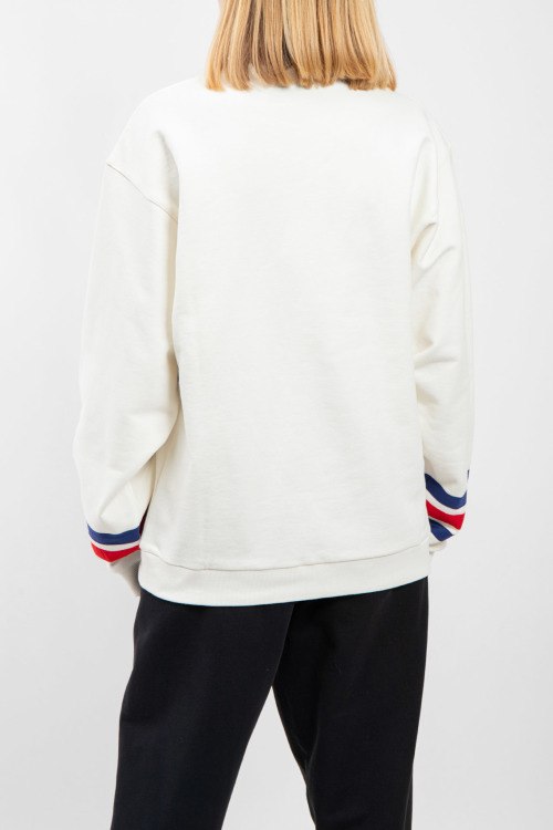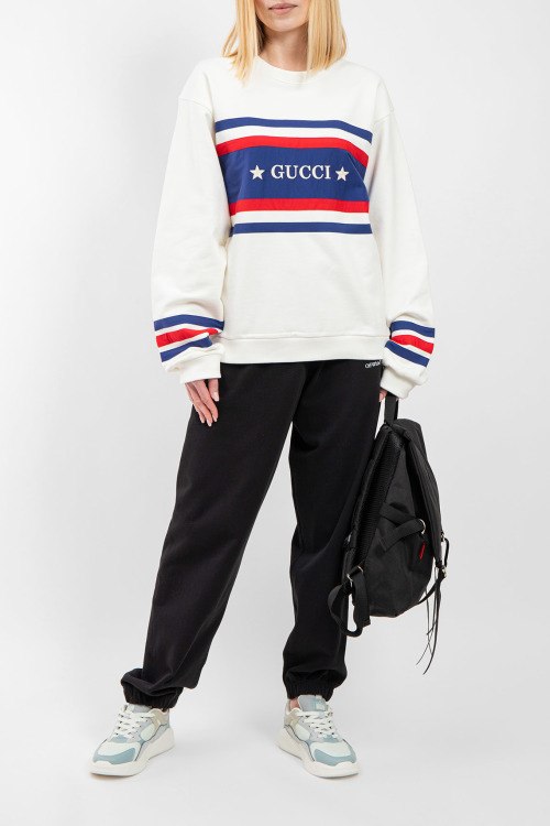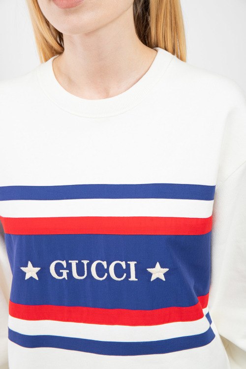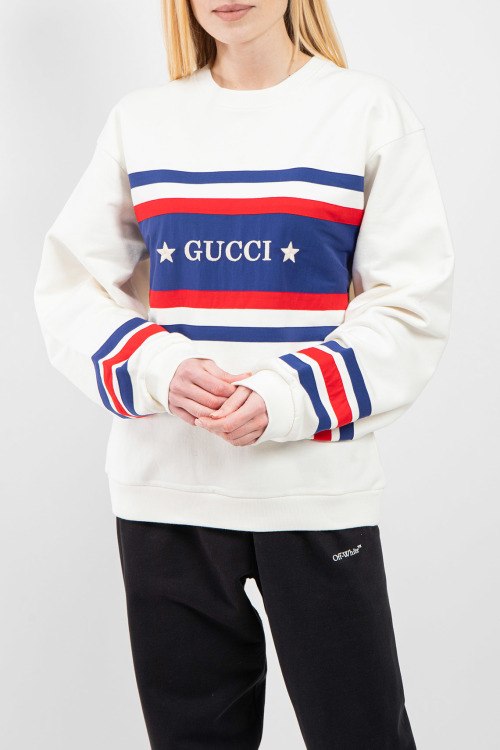 Детали: Женский белый хлопковый свитшот от Gucci (Гуччи). Принт с логотипом на груди, круглый вырез горловины, принт в полоску на рукавах, классическая длина, трикотажные манжеты и нижний край