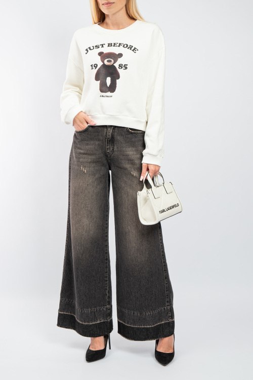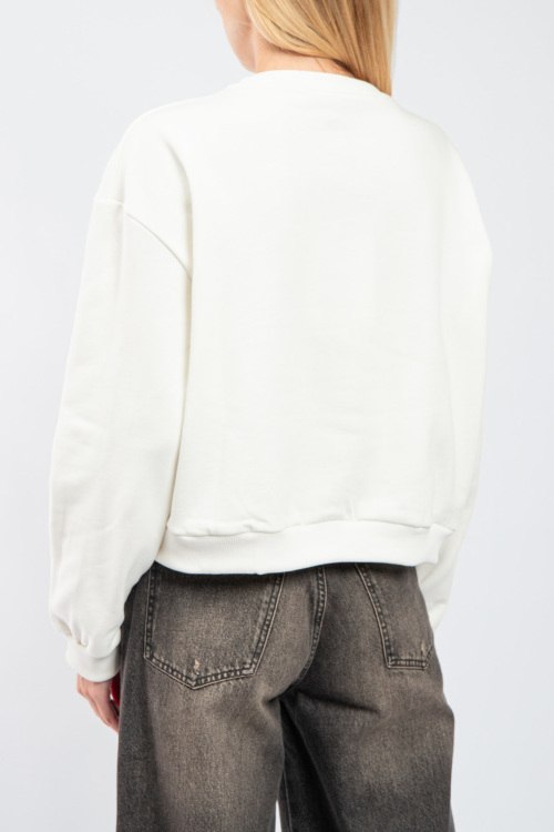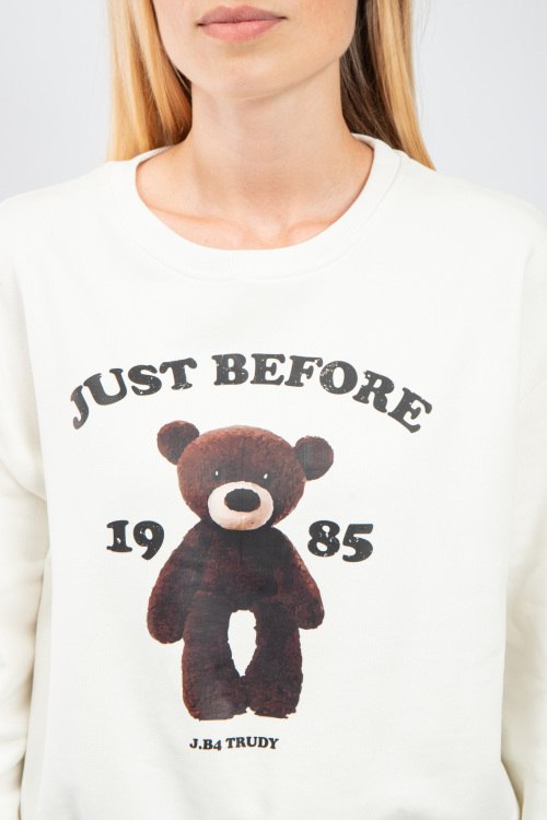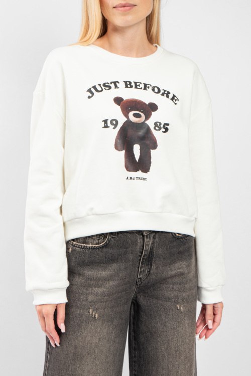 Женский белый хлопковый свитшот от J.B4 Just Before (Джаст Бифо). Принт на груди, круглый вырез горловины, классическая длина, трикотажные манжеты и нижний край.