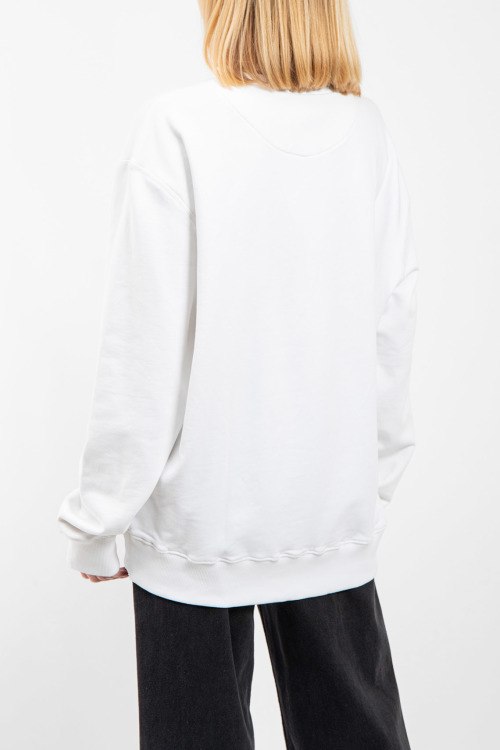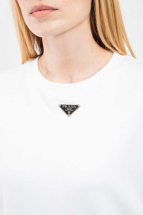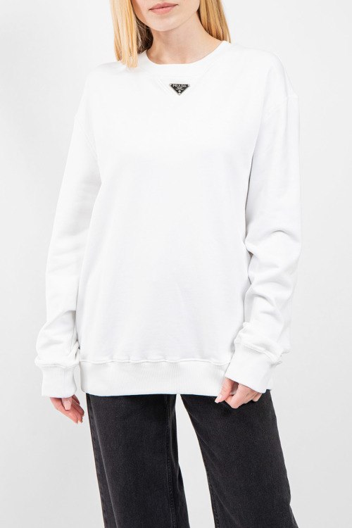 Женский белый хлопковый свитшот от Prada (Прада). Нашивка с логотипом на груди, круглый вырез горловины, удлиненная длина, трикотажные манжеты и нижний край.