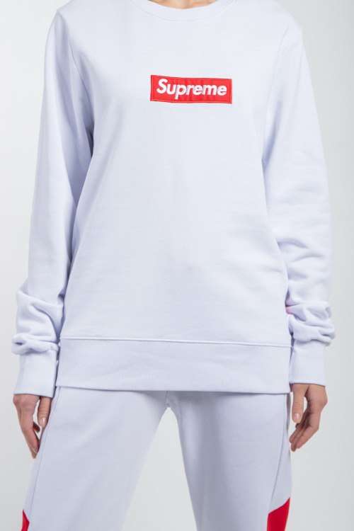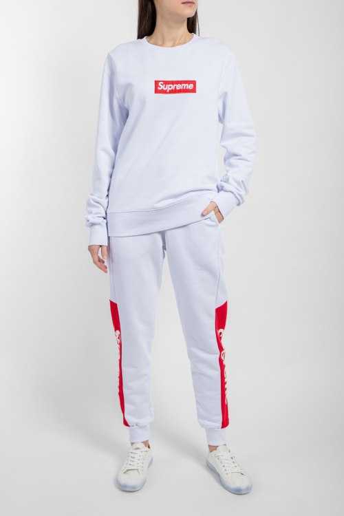 Женский белый свитшот из хлопка от Supreme Spain (Суприм Спейн). Удлиненная модель, круглый вырез горловины, длинные рукава, трикотажная резинка на манжетах и по низу изделия, вышитый логотип бренда на груди.