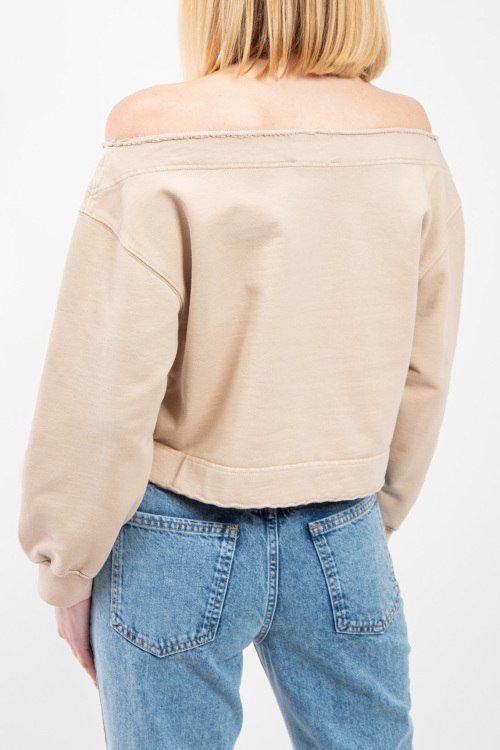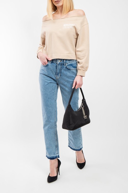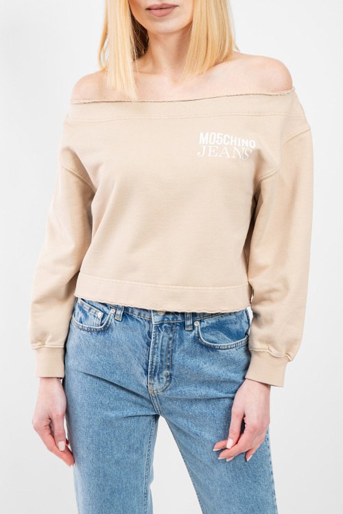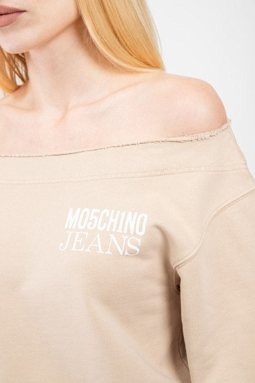 Женский бежевый свитшот из хлопка от Moschino (Москино). Классическая длина, открытые плечи, длинные рукава, приспущенная линия плеча, трикотажная резинка на манжетах и по низу изделия, принт с логотипом бренда на груди.