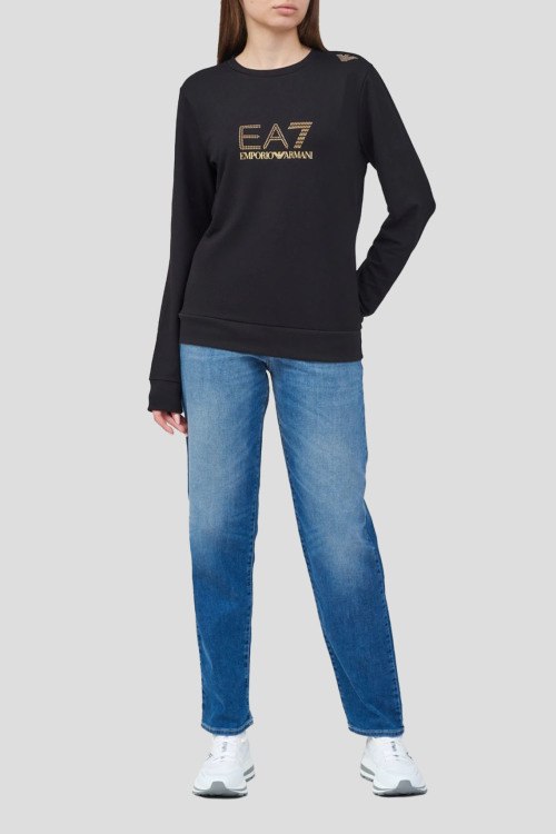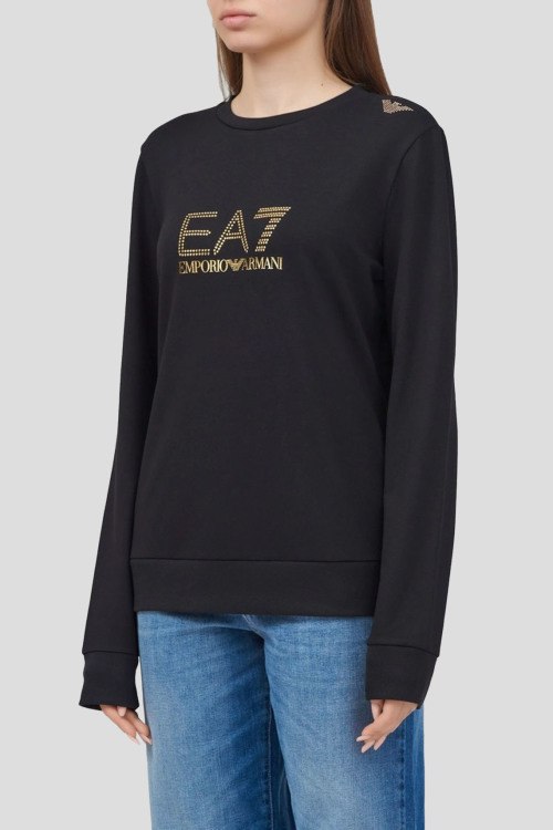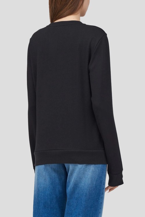 Детали: Женский черный свитшот из полиэстера и вискозы от Armani (Армани). Классическая длина, круглый вырез горловины, длинные рукава, декорирован кристаллами и логотипом бренда