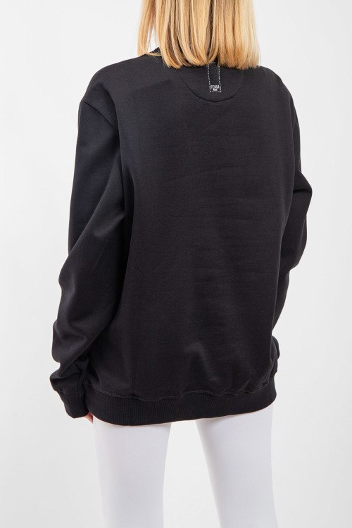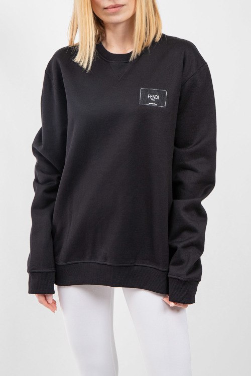 Женский черный хлопковый свитшот от Fendi (Фенди). Нашивка с логотипом на груди, круглый вырез горловины, фасон oversize, удлиненная длина, трикотажные манжеты и нижний край.