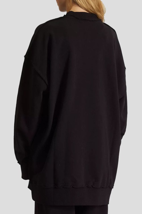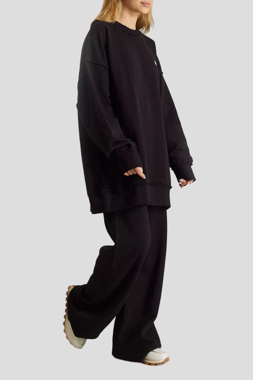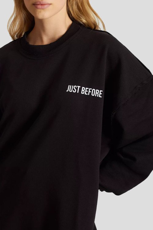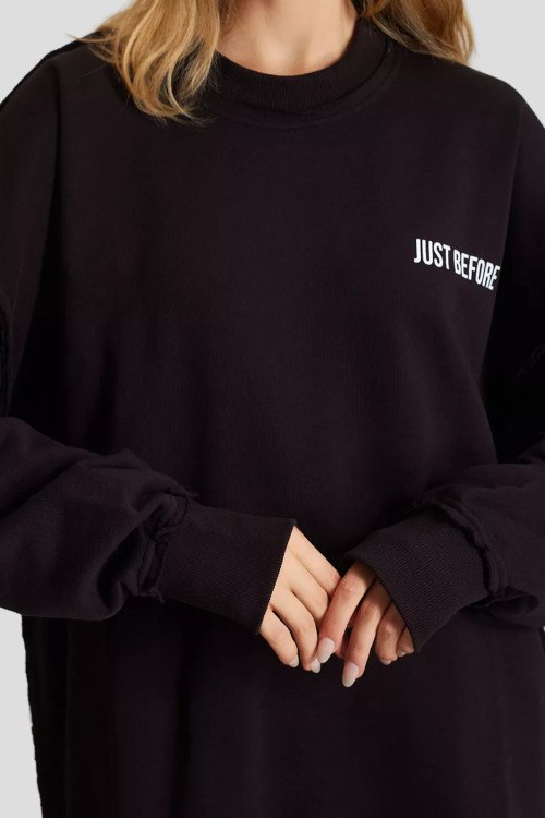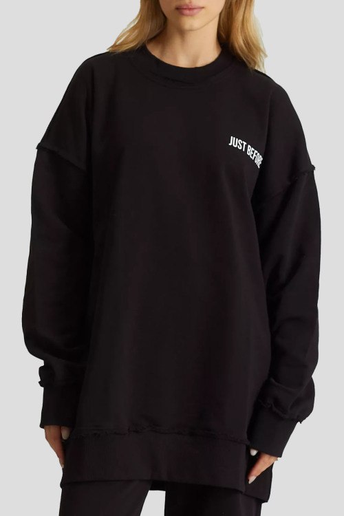 Детали: Женский черный свитшот из хлопка от J.B4 Just Before (Джаст Бифо). Модель oversize, круглы вырез горловины, длинные рукава, трикотажная резинка на манжетах и по низу изделия, брендированный принт