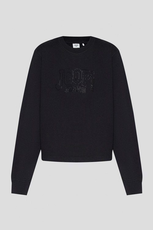 Детали: Женский черный хлопковый свитшот от Joop! (Йооп!). Логотип из кристаллов, круглый вырез горловины, трикотажные манжеты и нижний край. Длина рукава: длинный, для размера S - 62 см, обхват груди: для размера S - 110 см, обхват талии: для размера S - 104 см, длина изделия по среднему шву спинки от горловины: для размера S - 53,5 см