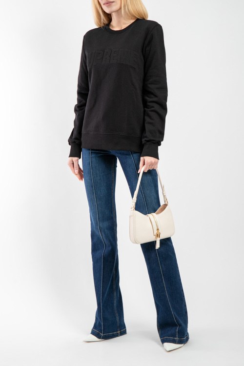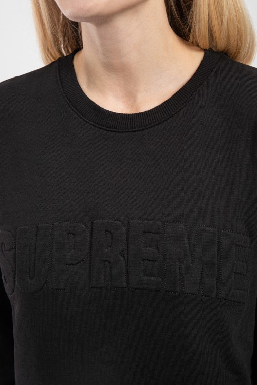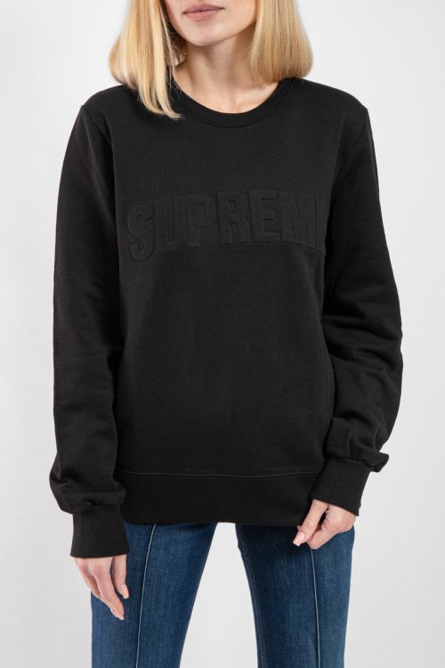 Женский черный свитшот из хлопка от Supreme Spain (Суприм Спейн). Круглый вырез горловины, длинные рукава, манжеты и низ изделия в рубчик, фактурный логотип бренда на груди.