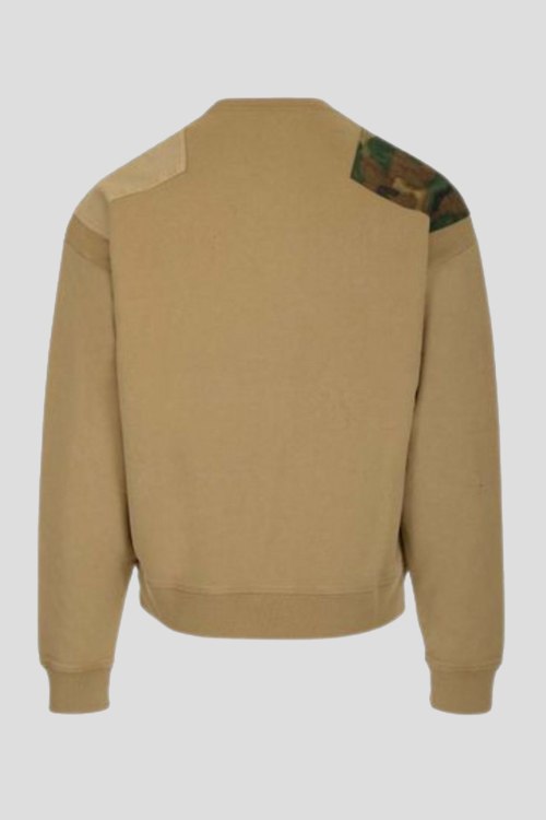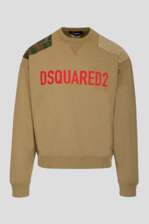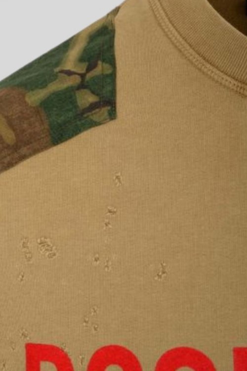Мужской свитшот Patch Cipro цвета хаки из хлопка от Dsquared2 (Дискваред). Классическая длина, круглый вырез горловины, длинные рукава, трикотажная резинка на манжетах и по низу изделия, логотип бренда спереди, дизайн с потертостями, рванные детали
