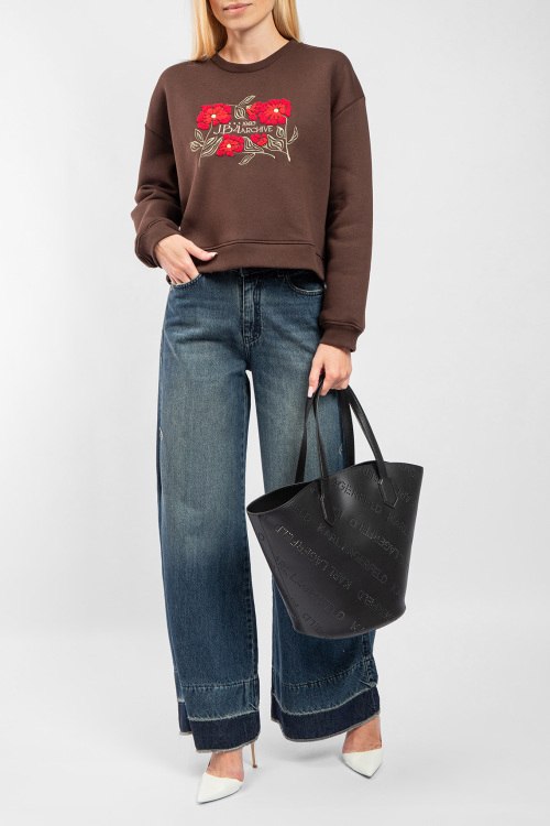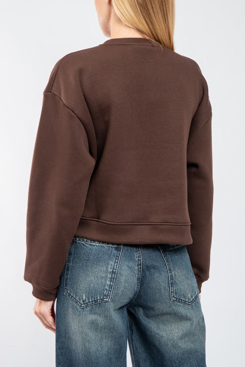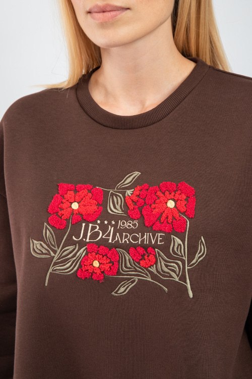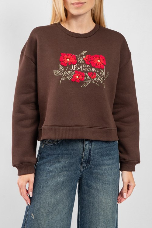 Женский коричневый хлопковый свитшот от J.B4 Just Before (Джаст Бифо). Вышивка на груди, круглый вырез горловины, классическая длина, трикотажные манжеты и нижний край.