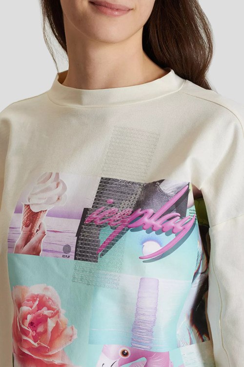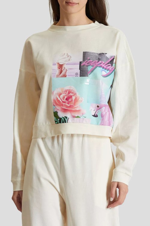 Детали: Женский свитшот молочного оттенка из хлопка от Ice Play (Айс Плей). Классическая длина, круглый вырез горловины, длинные рукава, трикотажная резинка на манжетах и по низу изделия, декорирована принтом