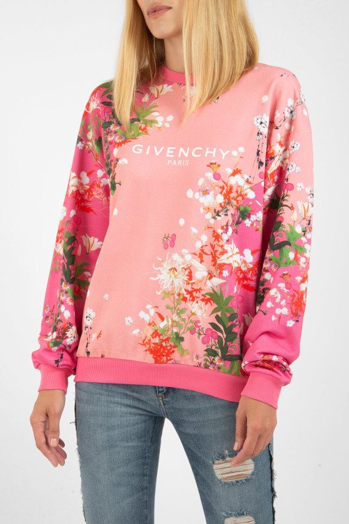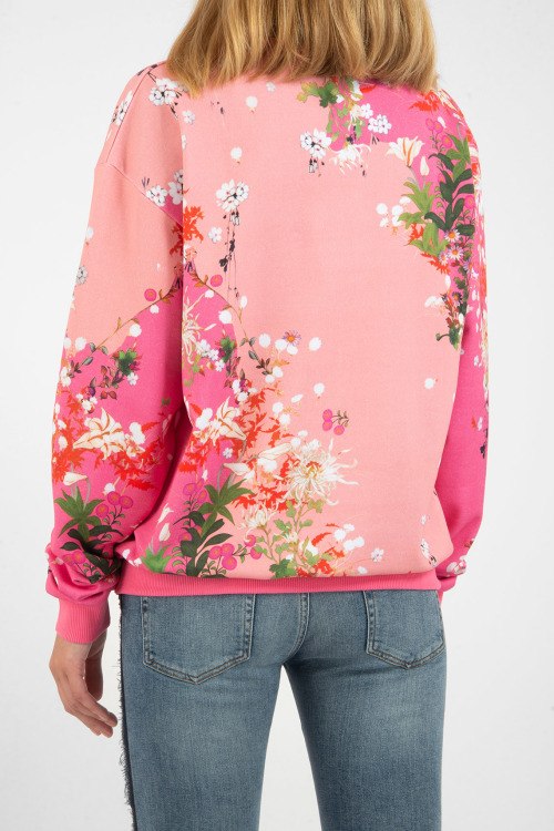 Розовый хлопковый свитшот. Флористический принт по всей поверхности, принт с логотипом, круглый вырез под горло, трикотажные манжеты и нижний край.