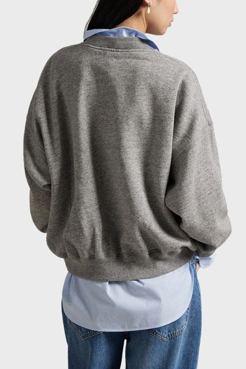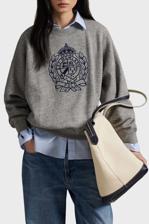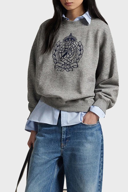 Детали: Женский серый свитшот из хлопкового микса от Polo Ralph Lauren (Поло Ральф Лорен). Круглый вырез горловины, длинные рукава, трикотажная резинка на манжетах и по низу изделия, выштитый логотип бренда