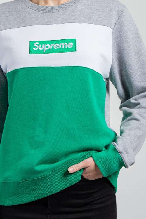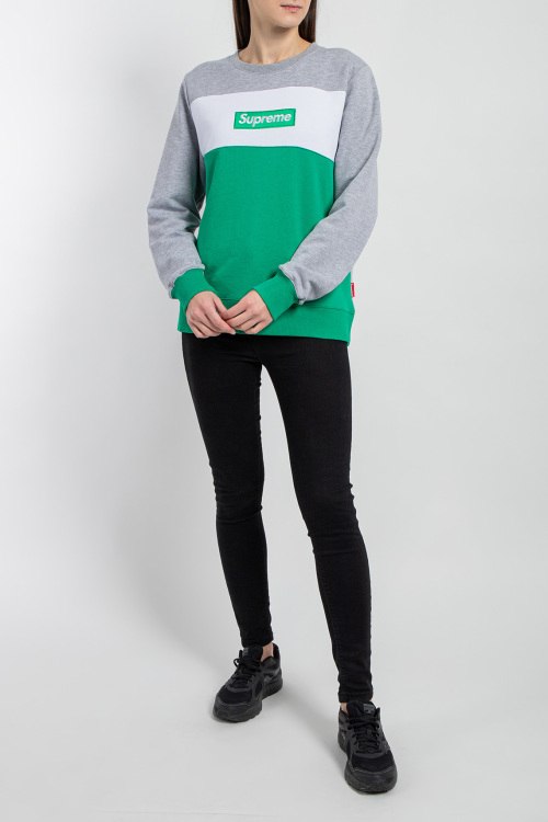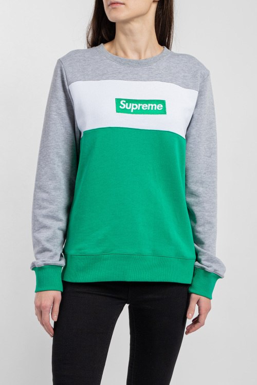 Женский серо-зеленый свитшот из хлопка от Supreme Spain (Суприм Спейн). Комбинированный дизайн, круглый вырез горловины, длинные рукава, трикотажная резинка на манжетах и по низу изделия, вышитый логотип бренда на груди.