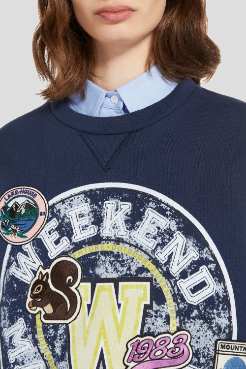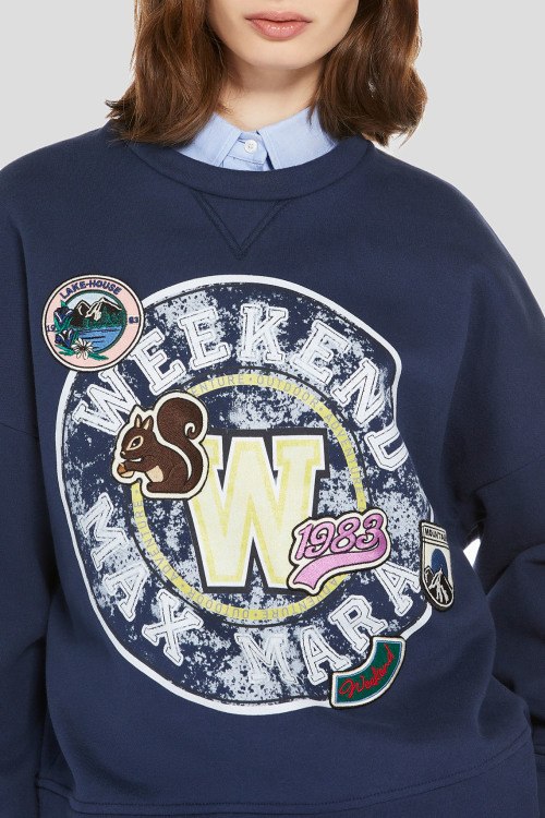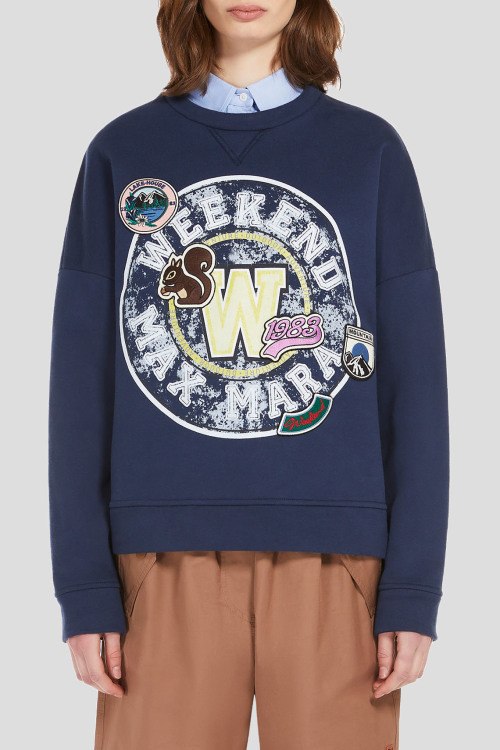 Детали: Женский темно-синий хлопковый свитшот Medea от Max Mara (Макс Мара). Логотип на груди, круглый вырез горловины, классическая длина, трикотажные манжеты и нижний край
