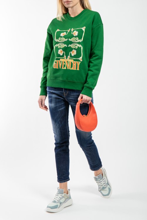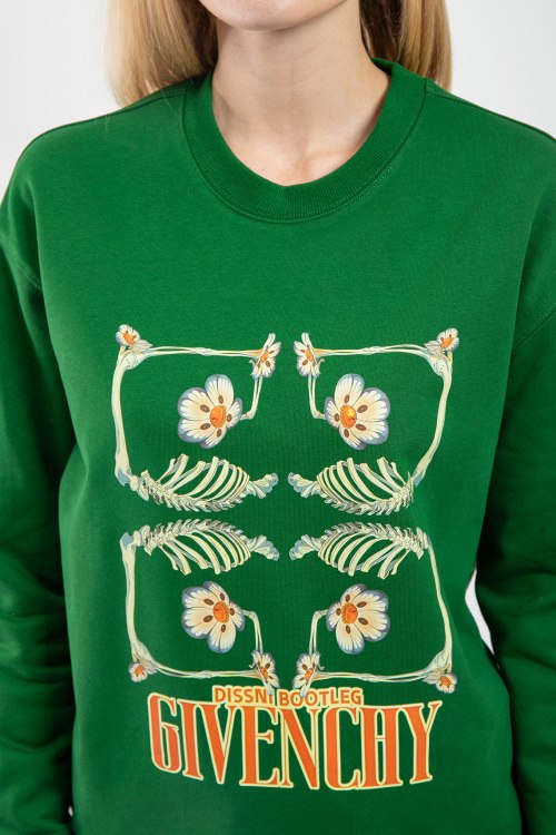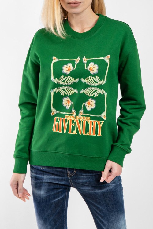 Женский зеленый хлопковый свитшот от Givenchy (Живанши). Принт с логотипом на груди, круглый вырез горловины, классическая длина, трикотажные манжеты и нижний край.