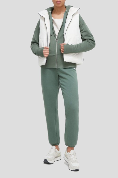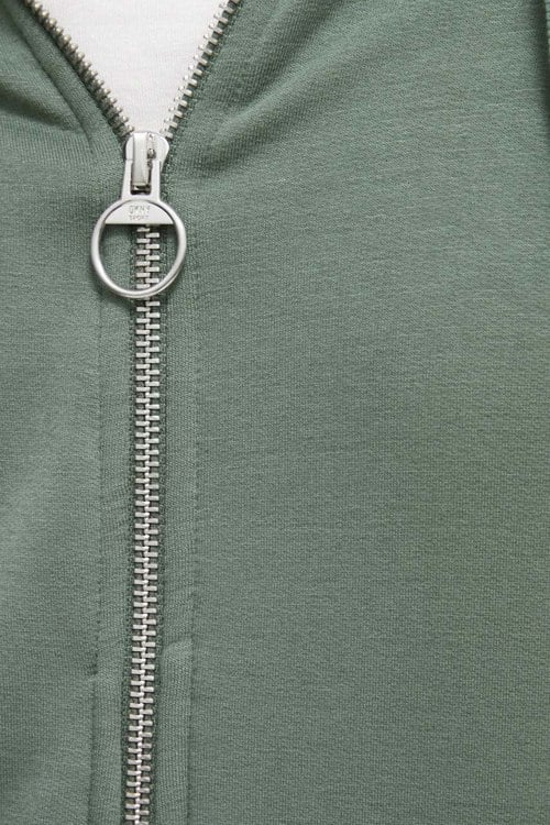 Детали: Женская зеленая спортивная кофта Greenwich из вискозного микса от Donna Karan (Донна Каран). Вшитый капюшон, застежка на молнию, длинные рукава, трикотажная резинка на манжетах и по низу изделия, манжеты с прорезями для большого пальца