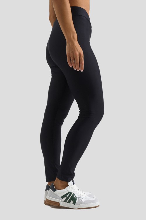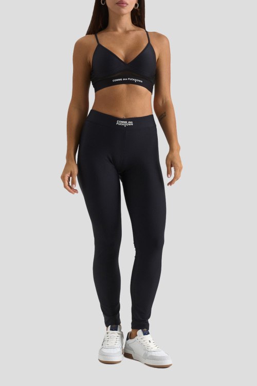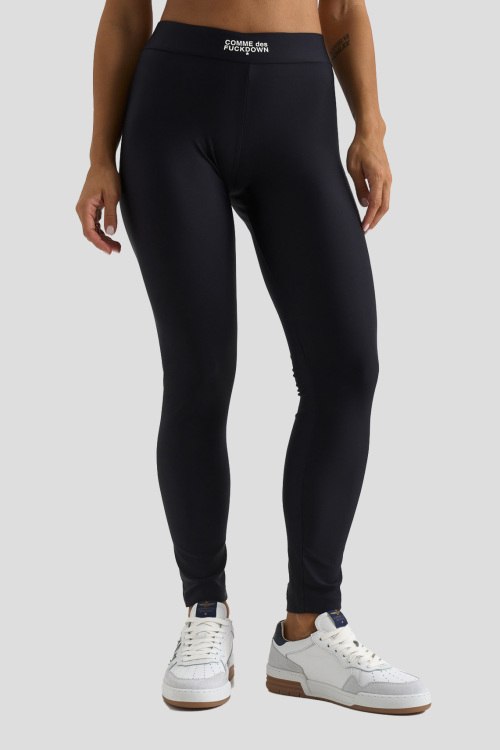 Детали: Женские черные спортвиные леггинсы из нейлона от Comme des Fuckdown (Камм дес Факдаун). Классическая длина, высокая посадка, эластичная резинка на поясе с логотипом бренда