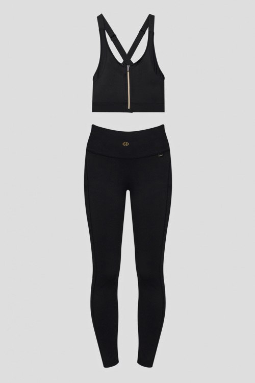 Детали: Женский черный тренировочный костюм от Goldbergh (Голдберг). Топ: застежка молния спереди, шлейки крест-накрест на спине, короткая длина. Замеры: обхват груди: для размера S - 62 см, длина изделия по среднему шву спинки от верхнего среза: для размера S - 6 см. Леггинсы: три кармана на молнии, эластичный пояс, логотип. Замеры: обхват пояса: для размера S - 70 см, обхват бедер: для размера S - 84 см, длина штанины: для размера S - 86 см, длина по шаговому шву: для размера S - 64 см