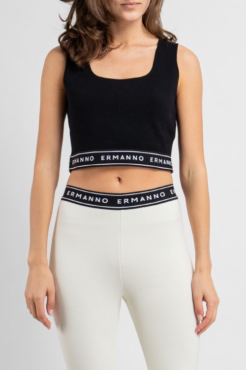 Детали: Женский черный топ из микса вискозы и полиэстера от Ermanno Scervino (Эрмано Шервино). Короткая длина, круглый вырез горловины, эластичная резинка с логотипом бренда по нижнему краю.