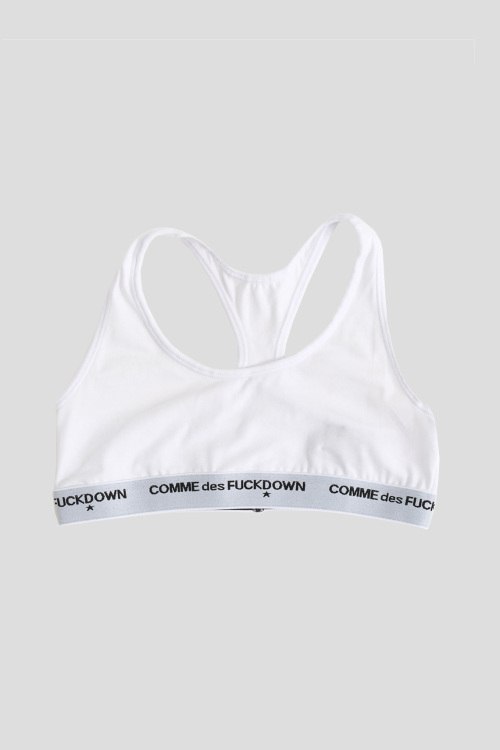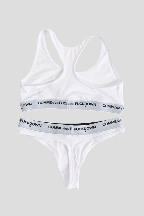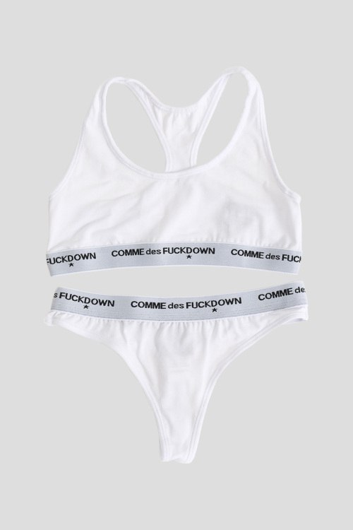 Детали: Женский белый комплект из хлопкового микса от Comme des Fuckdown (Камм дес Факдаун). Комплект состоит из топа и трусиков-стринги, эластичная резинка с логотипом бренда