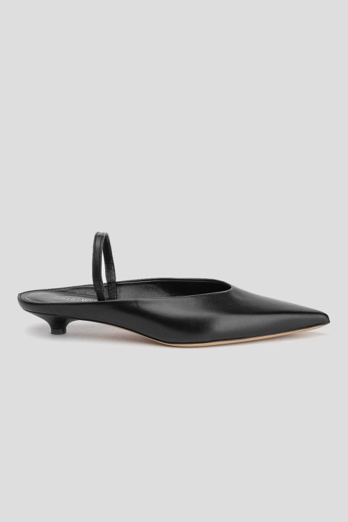 Детали: Женские черные туфли-слингбэки из натуральной кожи от Guglielmo Rotta (Гульельмо Ротта). Острый носок, кожаная стелька с логотипом, тонкий ремешок, маленький ремешок-рюмочка