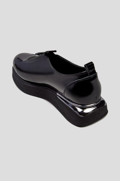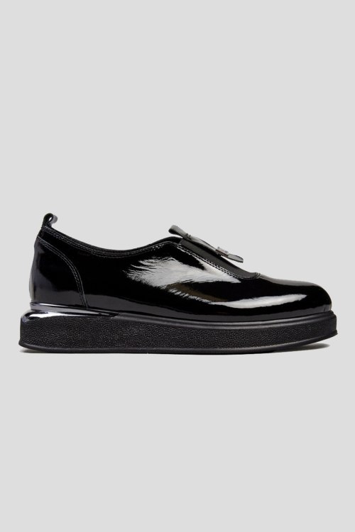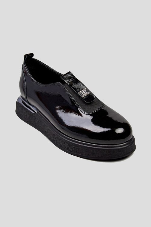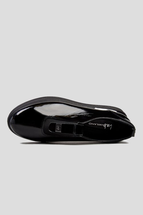 Детали: Женские черные лаковые туфли от Lab Milano (Лаб Милано). Глянцевый эффект, модель слип-он, эластичная резинка с металлической фурнитурой, закругленный носок, кожаная стелька
