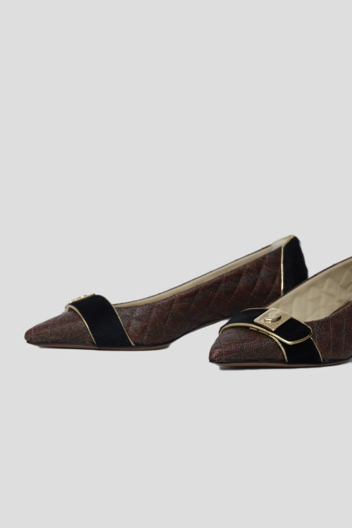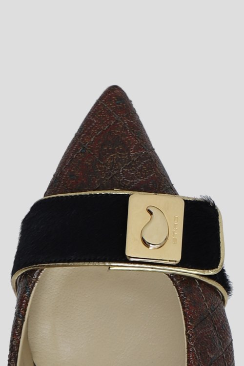 Женские коричневые туфли из натуральной кожи от Etro (Этро). Устойчивый небольшой каблук, острый носок, спереди вставка с металлической пряжкой, стеганая кожа, контрастный задник, золотистый каблук. Измерения: высота каблука 3, 5 см.