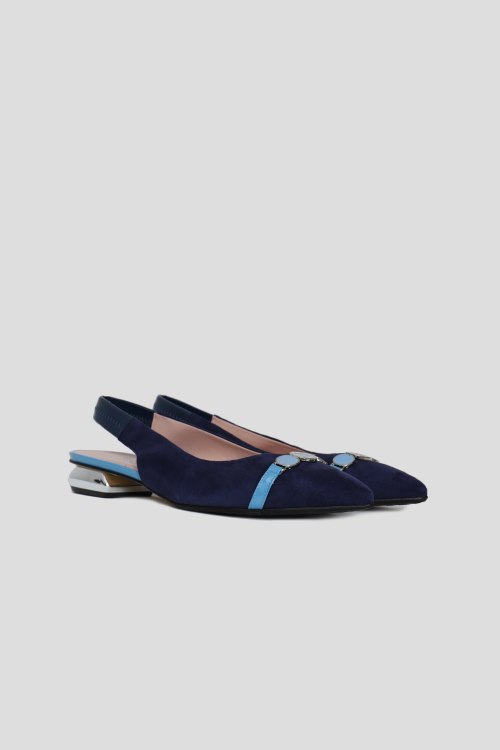 Детали: Женские темно-синие слингбэки из натуральной замши от Ilasio Renzoni (Илазио Ренцони). Низкий каблук с металлическим покрытием, ремешок фиксирующий пятку, узкий декорированный носок
