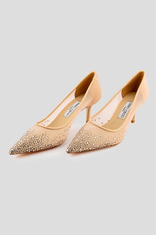 Детали: Женские бежевые текстильные туфли-лодочки Love от Jimmy Choo (Джимми Чу). Декор кристаллами, узкий носок, каблук-шпилька, кожаная стелька