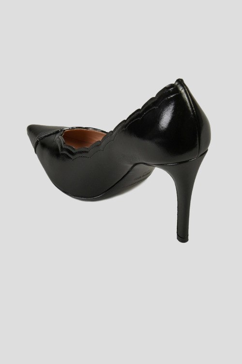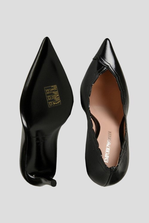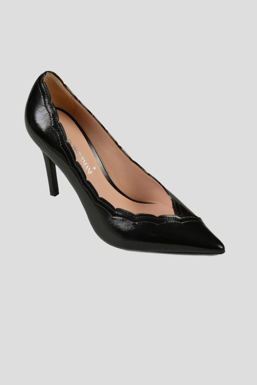 Детали: Женские черные туфли-лодочки из натуральной кожи от Armani (Армани). Заостренный носок, тонкий каблук, фигурные края, логотип на стельке. Высота каблука: 9,5 см