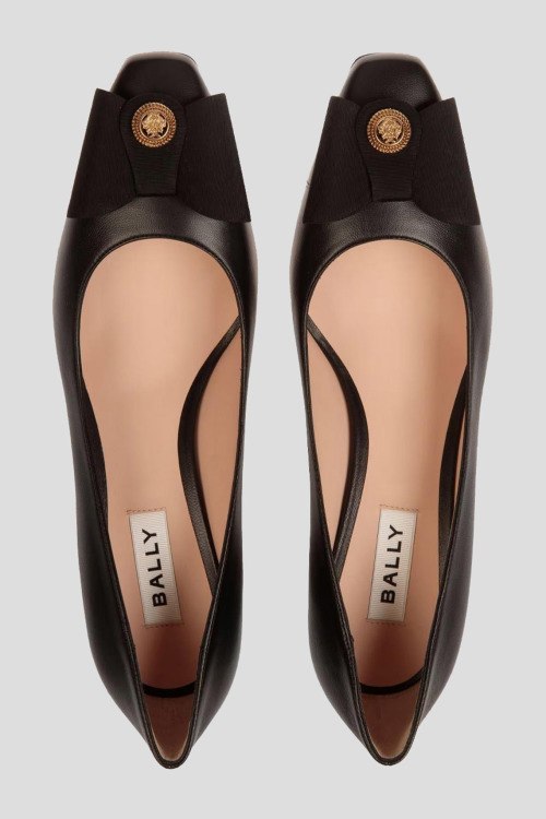 Детали: Женские черные кожаные туфли B-Bow Pump от Bally (Балли). Модель из гладкой кожи, декор бантом с золотистой фурнитурой, зауженный квадратный носок, изогнутый каблук