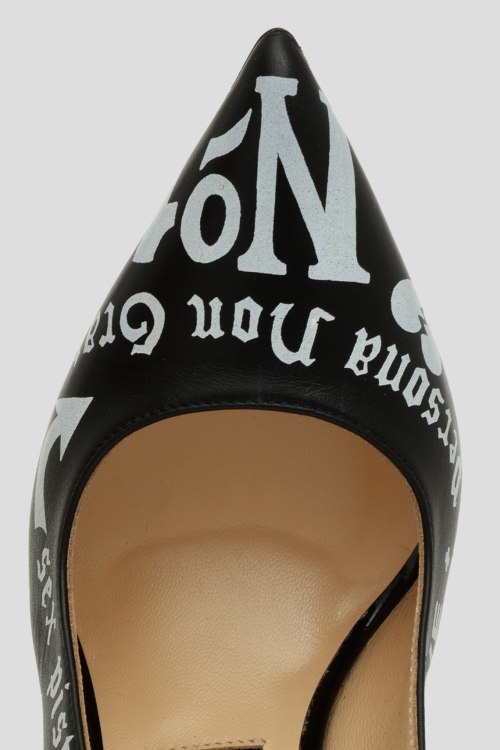 Туфли черного цвета на высоком каблуке-шпильке из натуральной кожи.. острый носок, застегиваются на щиколотке, украшены принтом