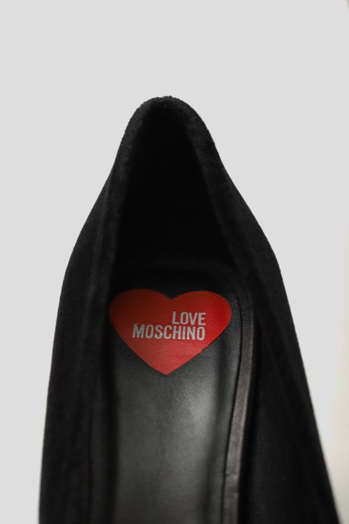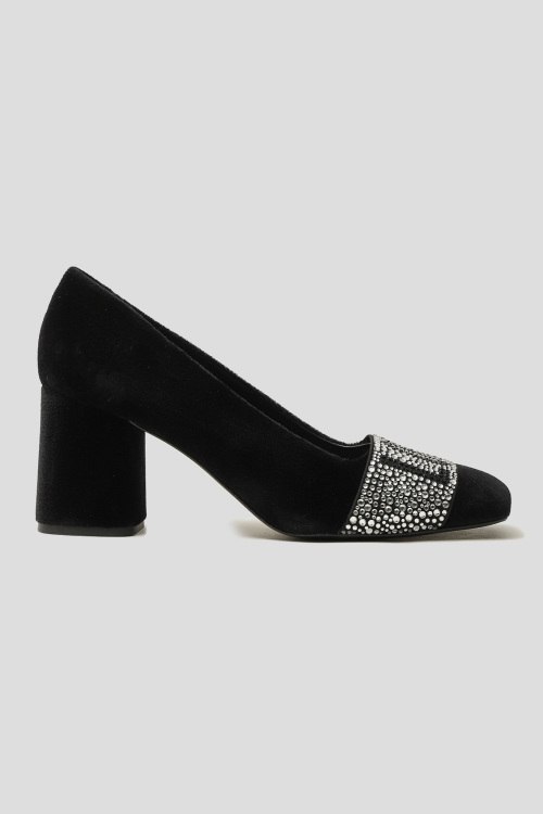 Женские черные туфли из замши от Love Moschino (Лав Москино). Квадратный носок, широкий высокий каблук, декорированы вставкой спереди со стразами с надписью ”Love”, внутри натуральная кожа. Измерения: высота каблука: 7,5 см