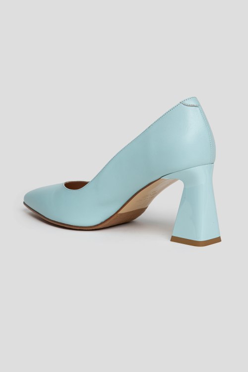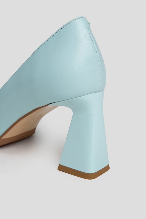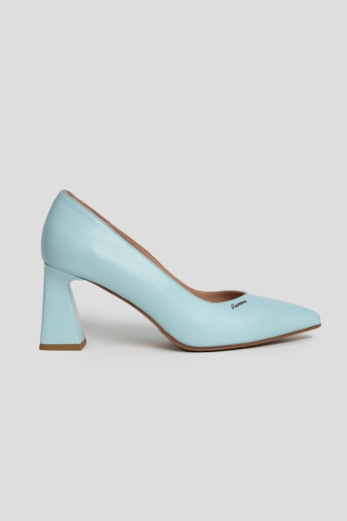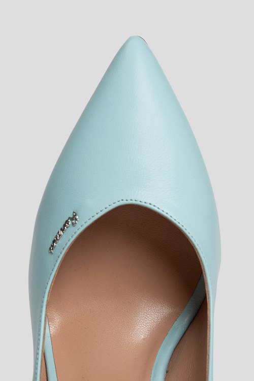 Детали: Женские голубые туфли из натуральной кожи от Ilasio Renzoni (Иласио Рензони). Острый носок, кожаная стелька, широкий высокий каблук, металлический логотип бренда. Измерения: каблук 8 см