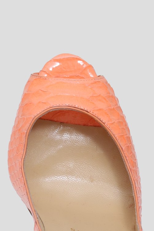 Детали: Женские оранжевые туфли из натуральной кожи питона от Christian Louboutin (Кристиан Лубутен). Каблук шпилька, открытый носок, анималистический рельеф, красная подошва, стелька с логотипом