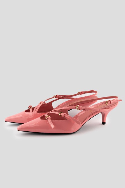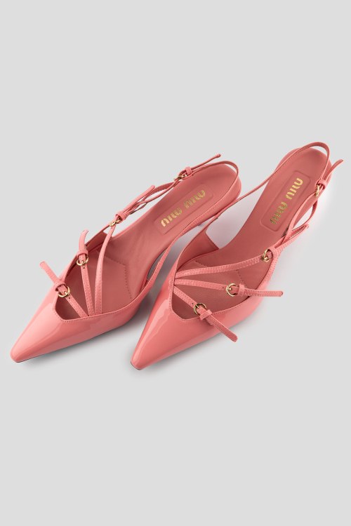 Детали: Женские розовые лакированные слингбэки от Miu Miu (Миу Миу). Глянцевое покрытие, тонкие ремешки с пряжками, узкий носок, кожаная стелька
