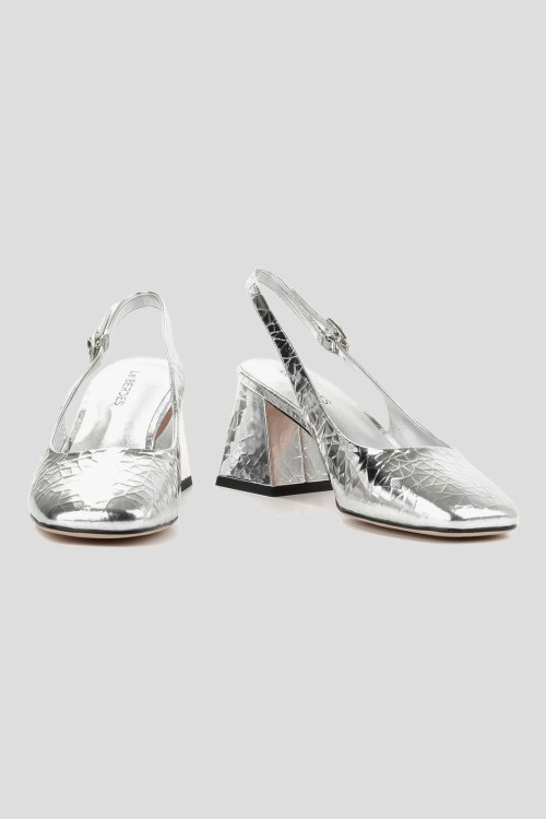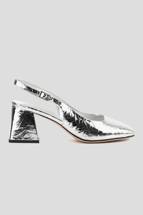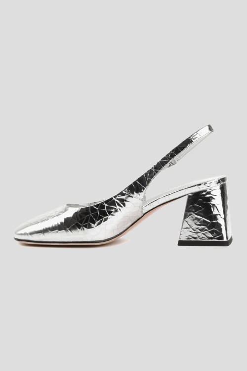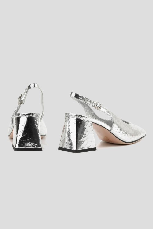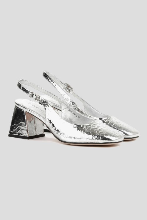 Детали: Женские серебристые кожаные слингбэки от Le Berdes (Ле Бердес). Эффект металлик, квадратный носок, ремешок с пряжкой на пятке, широкий каблук. Высота каблука: 7 см. Замеры: длина стельки: размер 35 (23 см), 36 (23,5 см), 37 (24 см), 38 (24,5 см), 39 (25 см),40 (25,5)