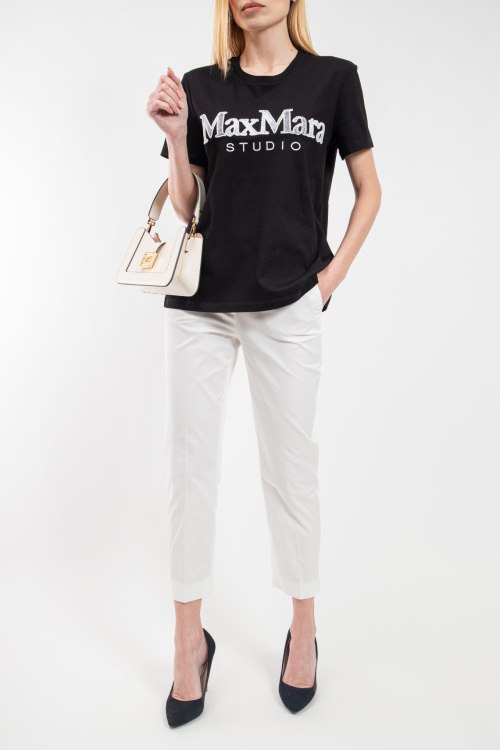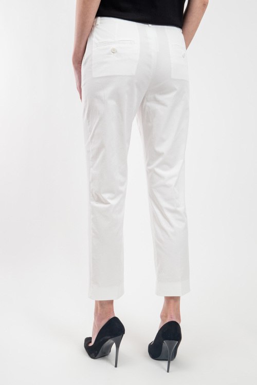 Женские белые хлопковые брюки Cecco от Max Mara Weekend (Макс Мара Викенд). Дизайн со стрелками, боковые и задние карманы, пояс с петлями для ремня, зауженный фасон, укороченная длина.