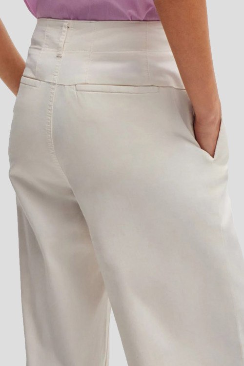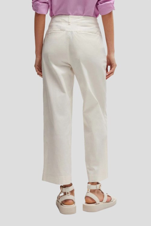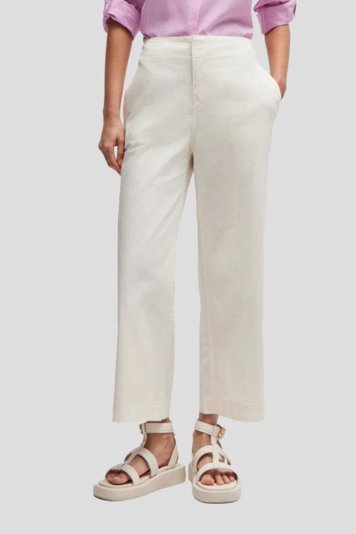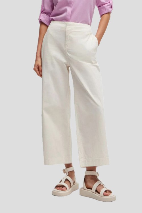 Детали: Женские бежевые кюлоты из хлопкового микса от Hugo Boss (Хуго Босс). Укороченная длина, высокая посадка, застежка на молнию, прорезные карманы, петли в поясе для ремня, расклешенная модель