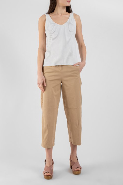 Женские бежевые брюки из хлопка от Sfizio (Сфизио). Укороченная длина, свободный силуэт, застежка на молнию, четыре кармана, сзади цветная вышивка.