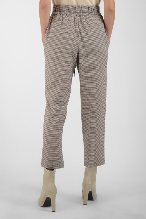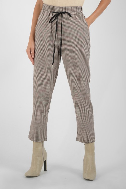 Брюки бежевого цвета в мелкую клетку, высокая посадка пояса с кулиской, боковые карманы, укороченная модель