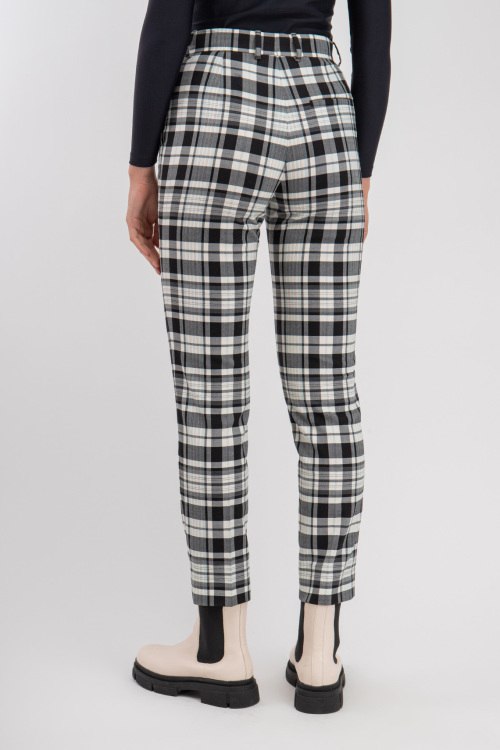 Женские черно-белые брюки из шерстяного микса от Balenciaga (Баленсиага). Укороченная длина, высокая посадка пояса, застёжка на молнию, боковые карманы, петли в поясе для ремня.