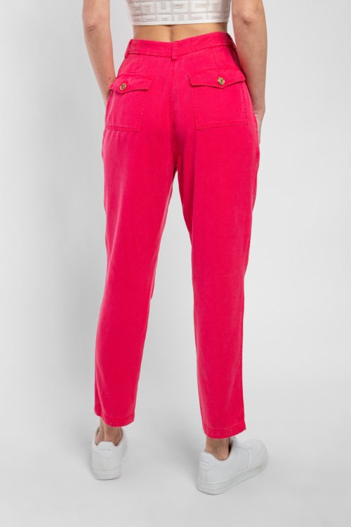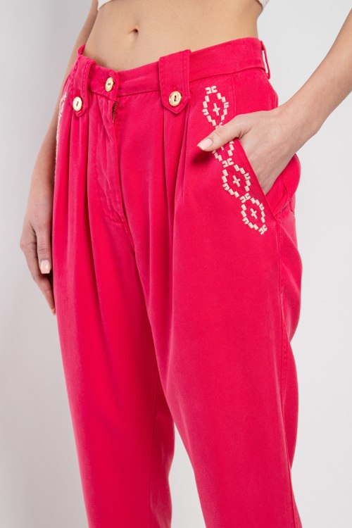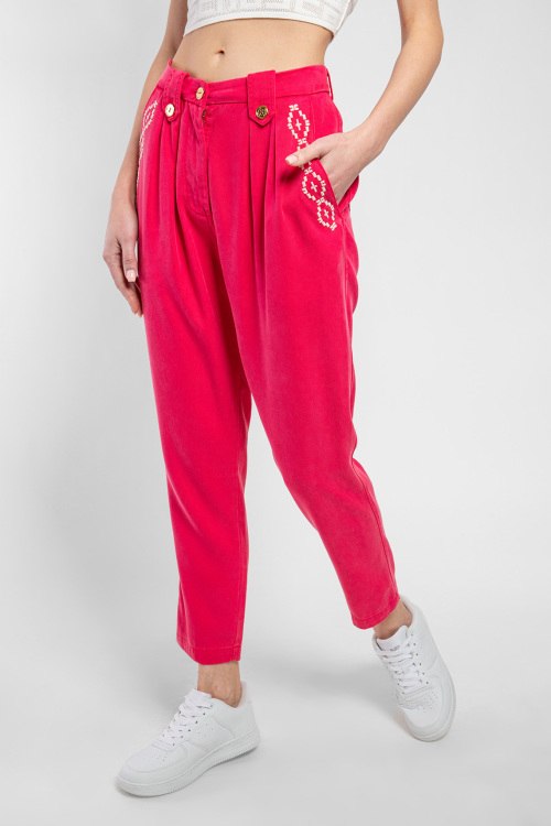 Детали: Женские хлопковые брюки цвета фуксии от Elisabetta Franchi (Елизабетта Франчи). Дизайн с защипами, контрастная вышивка, боковые и задние карманы, пояс с петлями для ремня, укороченная длина