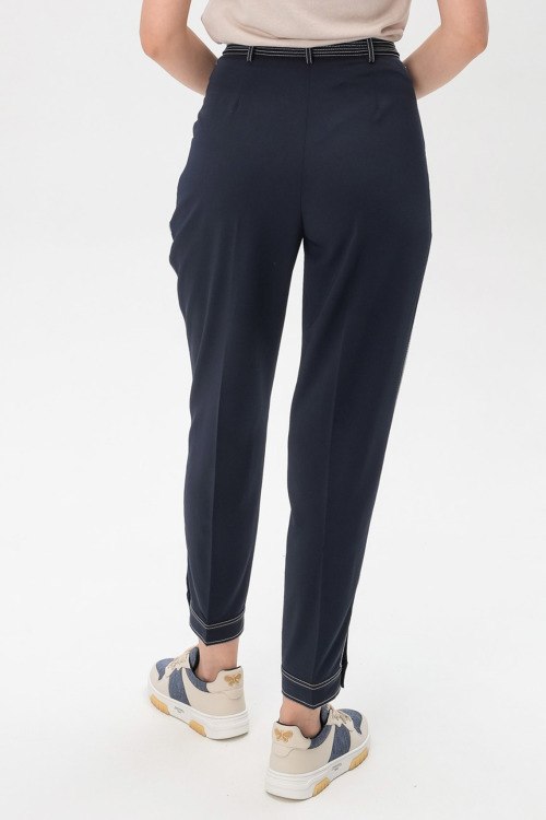 Детали: Женские темно-синие брюки из полиэстера от Ermanno Scervino (Эрманно Шервино). Укороченная длина, высокая посадка, застежка на молнию и пуговицу, пояс в тон изделия, прорезные боковые карманы
