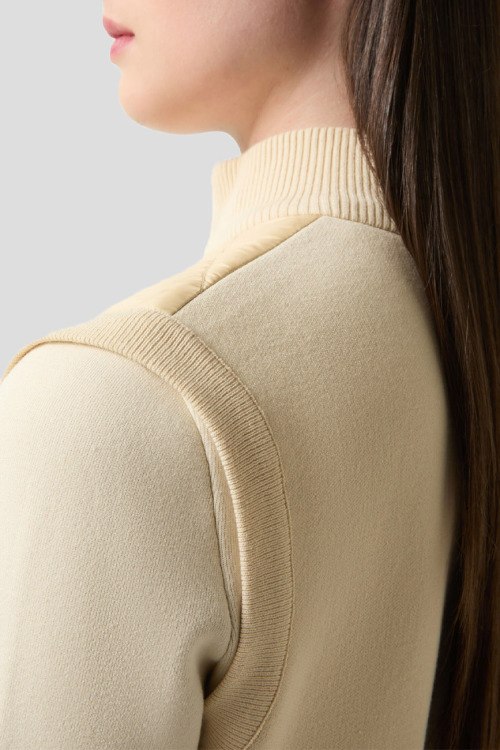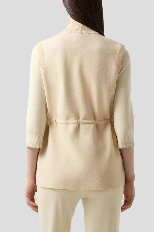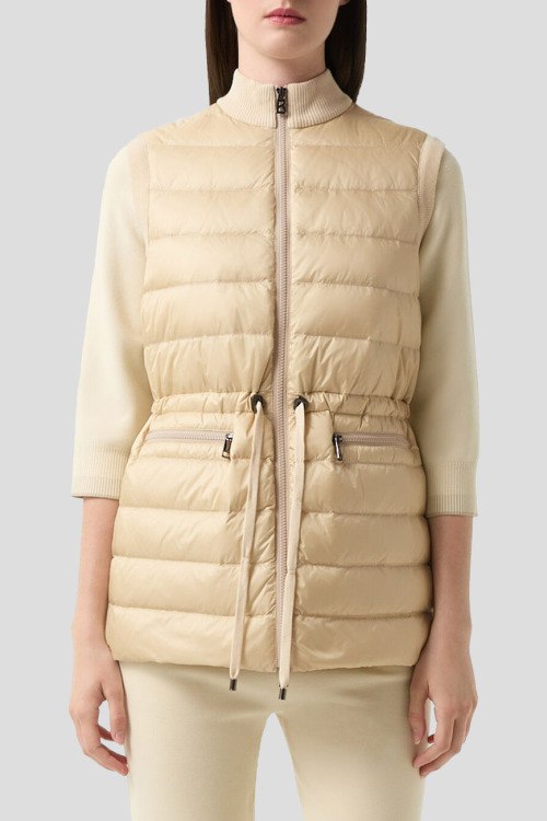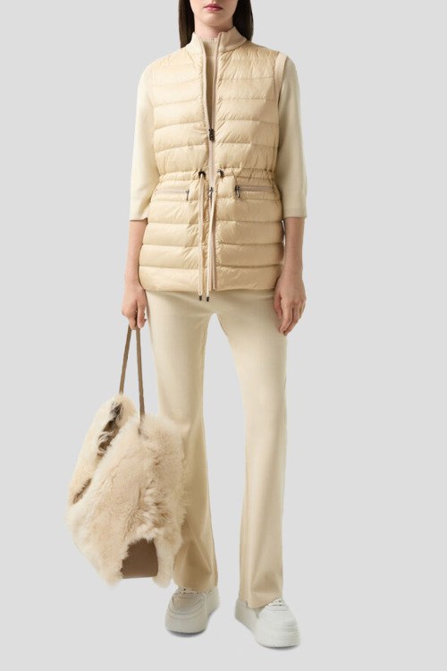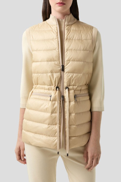 Детали: Женский бежевый жилет на пуху Arina от Bogner (Богнер). Стеганый дизайн, трикотажная спинка, воротник-стойка, передние карманы на молнии, застежка-молния, в талии на кулиске, пуховый наполнитель, удлиненная длина