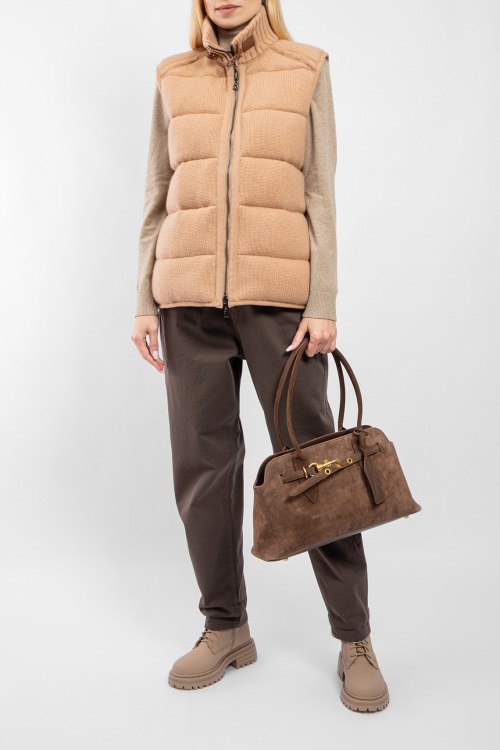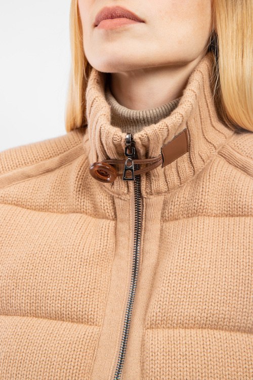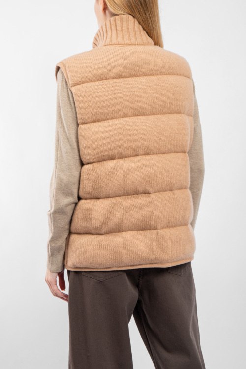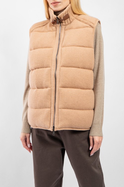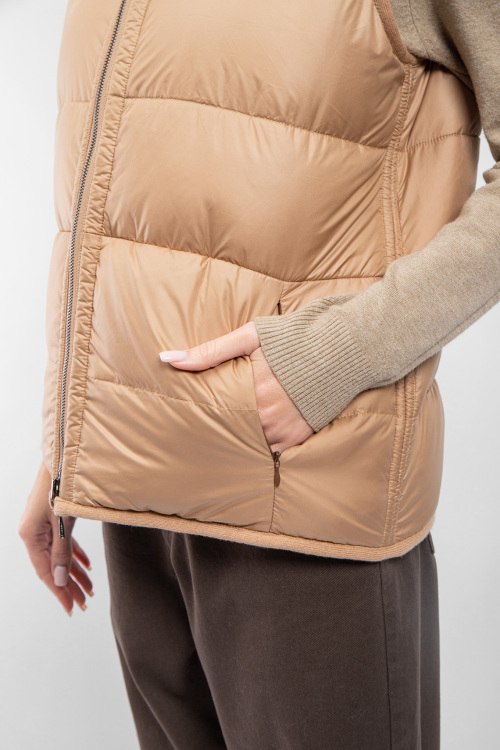 Женский бежевый двусторонний жилет из шерсти и кашемира на пуху от Diego M (Диего М). Стеганый дизайн, высокий воротник с застежкой, боковые карманы, застежка-молния, классическая длина, наполнитель из микса пуха и пера. Замеры для размера 44: длина: 65 см, ширина по груди: 57 см, ширина по талии: 57 см.