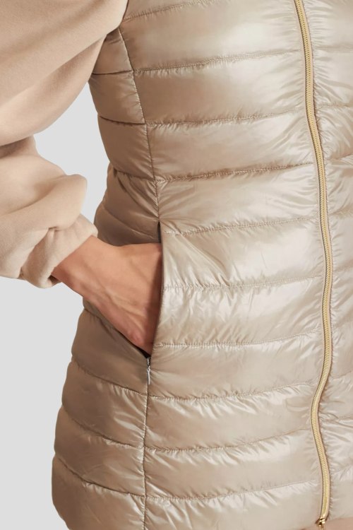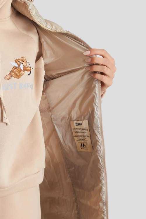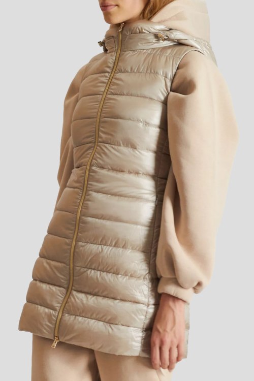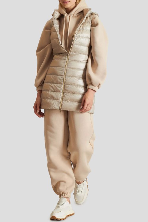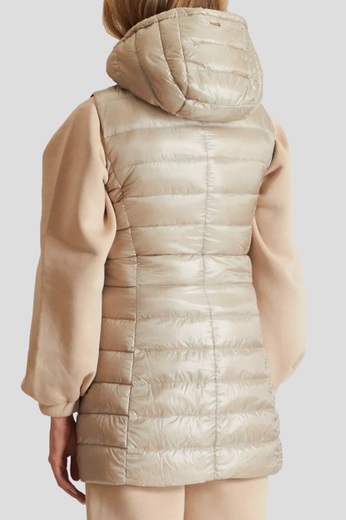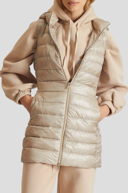 Детали: Женский бежевый жилет на пуху от Herno (Эрно). Вшитый капюшон, стеганый дизайн боковые карманы, застежка-молния, удлиненная длина, наполнитель из микса пуха и пера