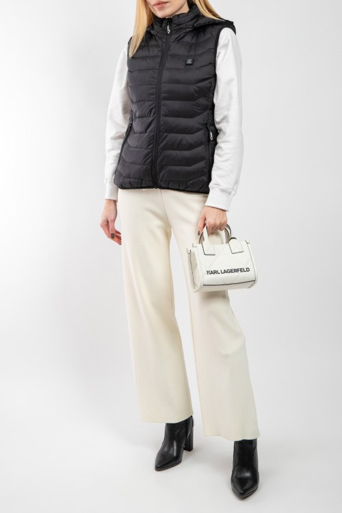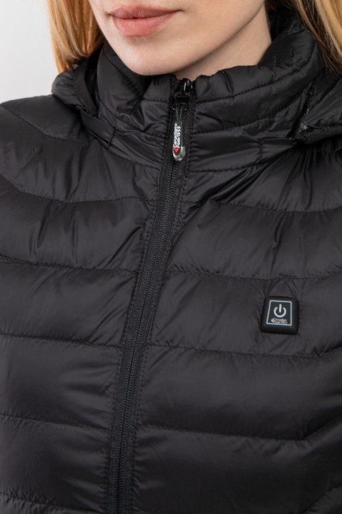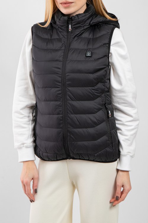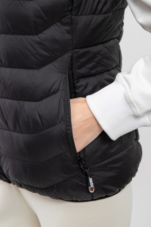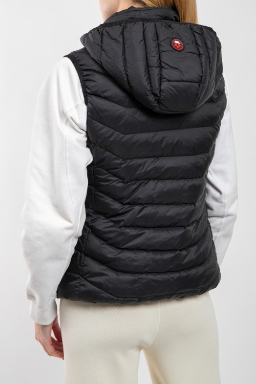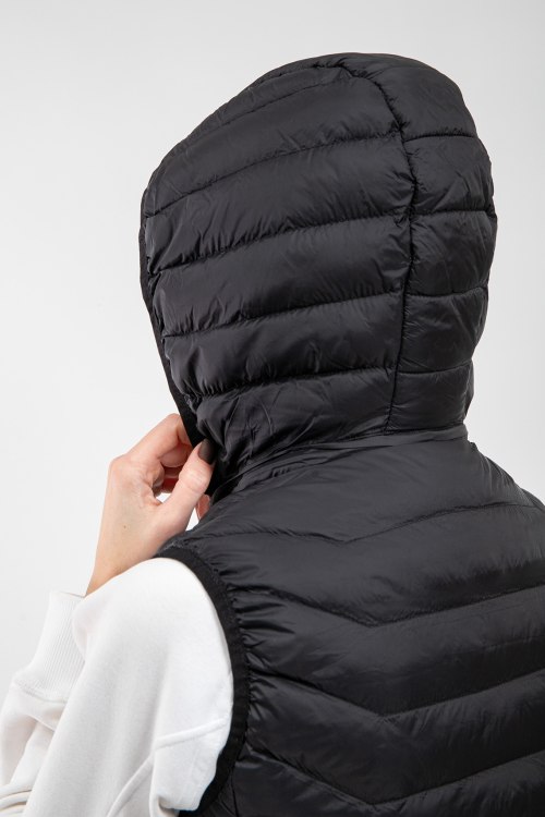 Женский черный жилет из полиамида от Сanadian Peak ( Канадиан Пик). Стеганый дизайн, застежка на молнию, прорезные карманы, съемный капюшон, патч-лого на груди, модель утепленная синтепухом.