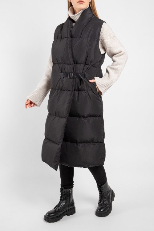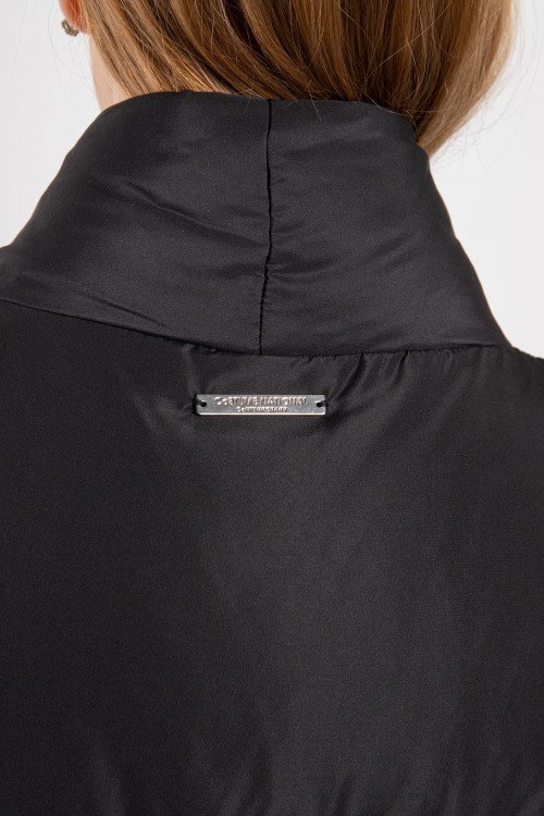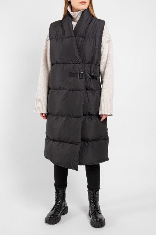 Женский черный жилет из нейлона от Costume National (Костюм Националь). Стеганый дизайн, длина ниже колен, V-образный воротник, модель на запах, застежка на ремешок сбоку, боковые прорезные карманы, модель утепленная миксом из пуха и пера