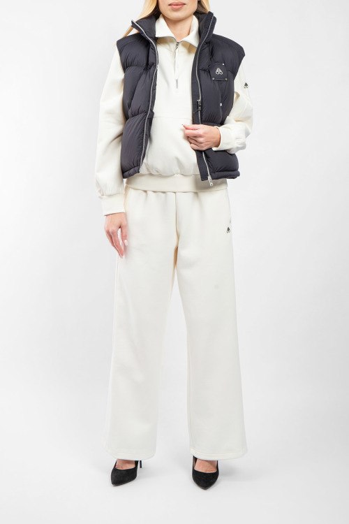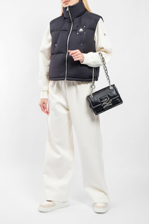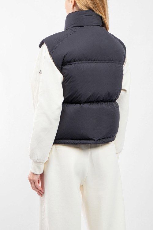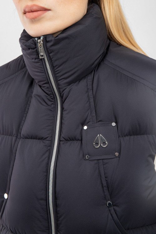 Женский черный жилет на пуху Everest от Moose Knuckles (Мус Наклс). Стеганый дизайн, высокий воротник, нашивка с логотипом на груди, боковые карманы, застежка-молния, классическая длина, наполнитель из микса пуха и пера.