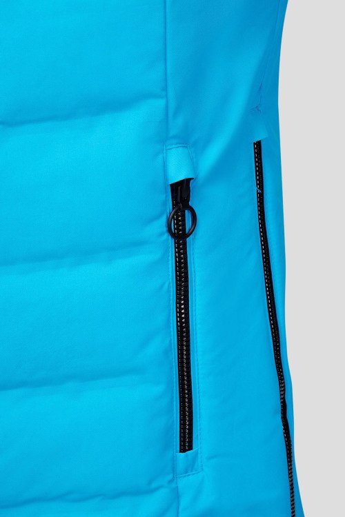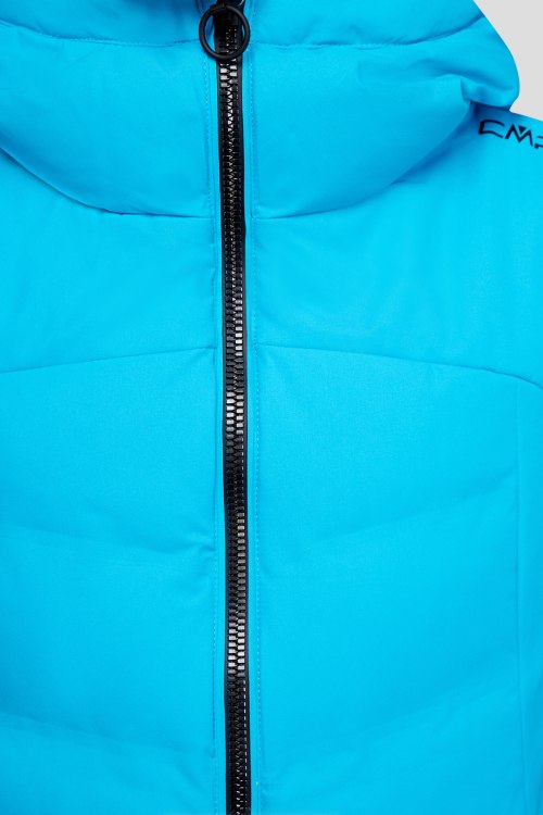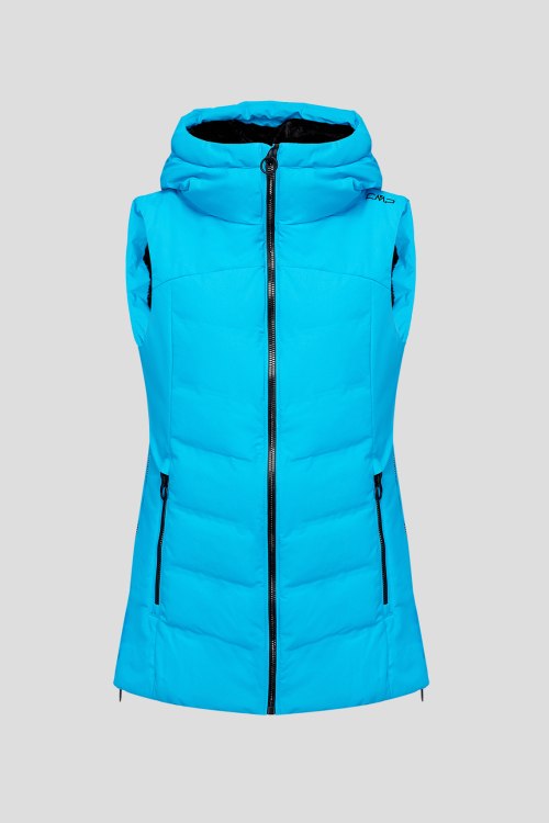Женский бирюзовый жилет от CMP (СМП). Вшитый капюшон, принт с логотипом, боковые карманы на молнии, застежка-молния. Технологии: Clima Protect. Размерная сетка - большемерит. Размеру 36 соответствуют замеры: обхват груди: 98 см, обхват талии: 92 см, длина изделия: 70 см
